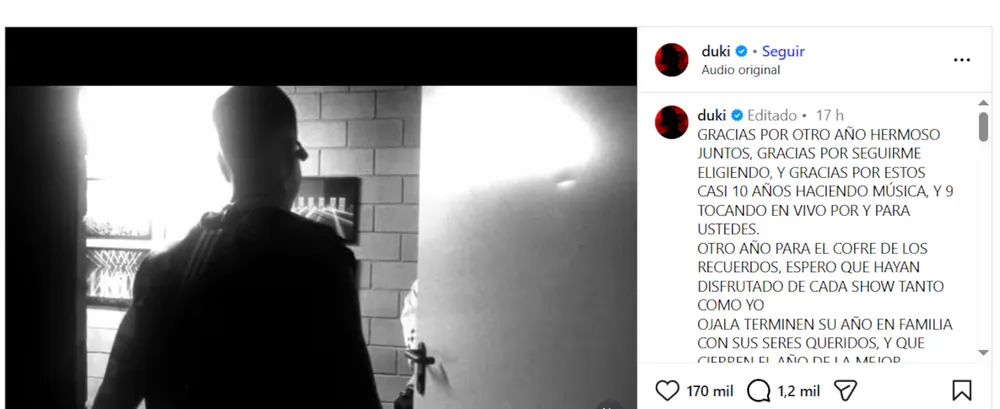 A través de su cuenta de Instagram, el artista abrió su corazón para agradecer el apoyo incondicional que recibió desde sus inicios. “Gracias por otro año hermoso juntos, gracias por seguirme eligiendo, y gracias por estos casi 10 años haciendo música, y 9 tocando en vivo por y para ustedes”, comenzó escribiendo el líder del trap local, reconociendo el largo camino recorrido desde las plazas hasta los estadios más importantes del mundo.