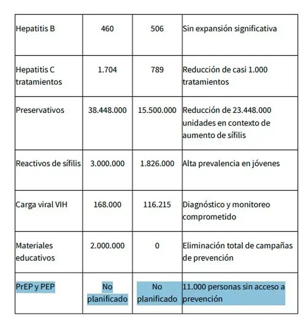 De acuerdo al cálculo de GEP sobre el Presupuesto, 11 mil personas se verían afectadas sin presupuesto específico destinado para PrEp y PEP. “Este año en el presupuesto no están previstas metas puntuales. “Antes, por ejemplo en 2023 la meta del indicador PrEp y PEP eran 6.000 y 5.000. Eso daba 11.000. Eso es lo que está presentado en el presupuesto del 2023, luego prorrogado. Después dejó de aparecer PREP y PEP en las metas”, puntualizó Di Bello.