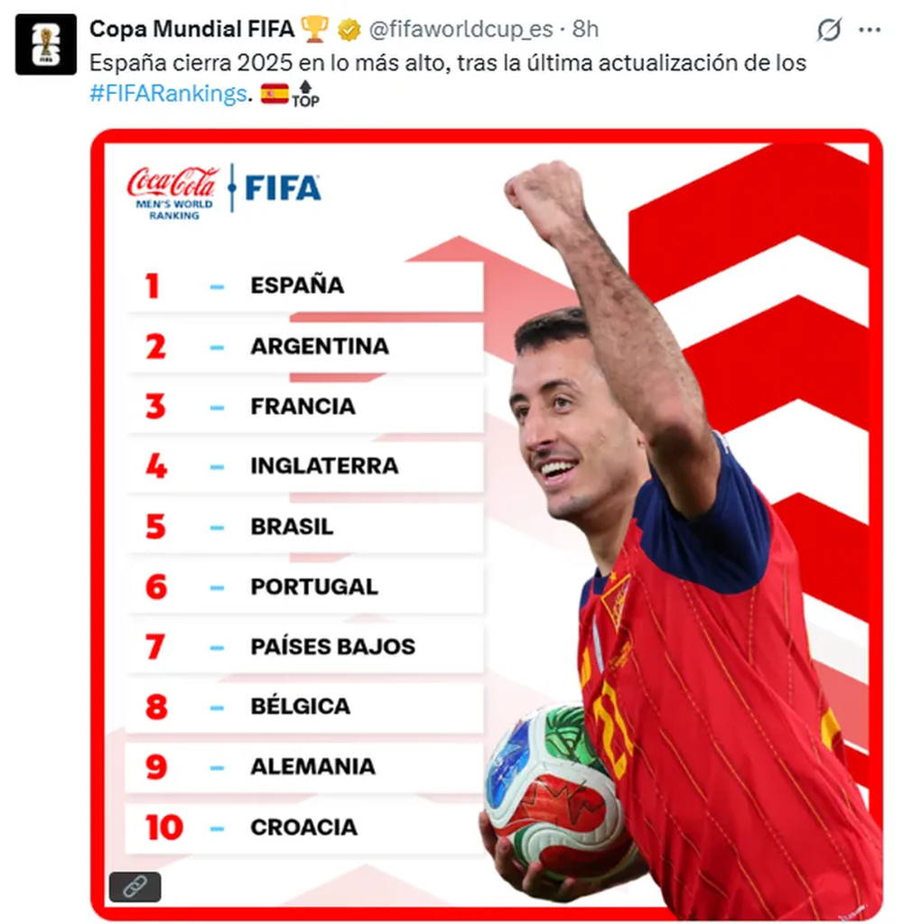 La nueva actualización de la tabla de mejores países tiene como líder a España con 1877.18 puntos, seguida por Argentina con 1873.33. Francia cierra el podio con 1870 unidades. Además, no hay cambios en el top ten que mantiene a Inglaterra (4), Brasil (5), Portugal (6), Países Bajos (7), Bélgica (8), Alemania (9) y Croacia (10) como los mejores equipos del mundo.